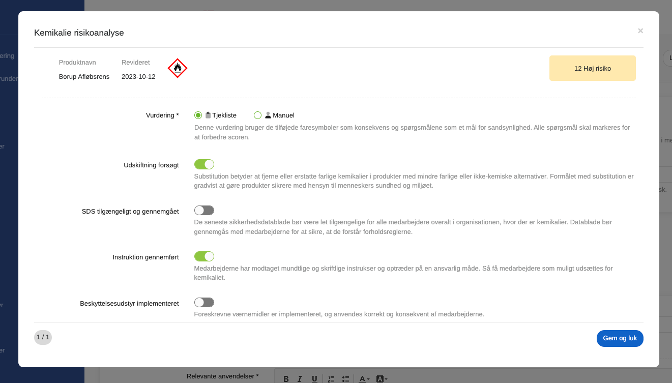 • Tjekliste - automatisk vurdering baseret på dine svar og kemikaliets "iboende farer" dvs de faremærker det har.